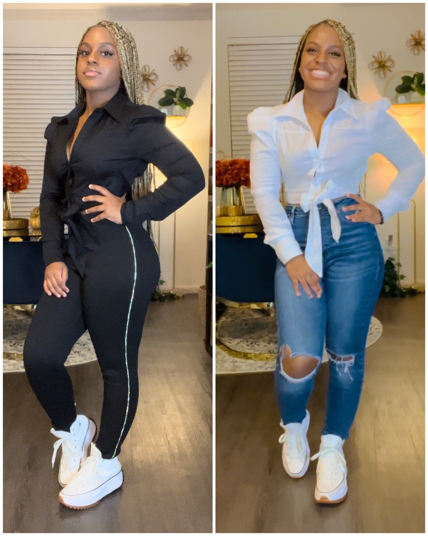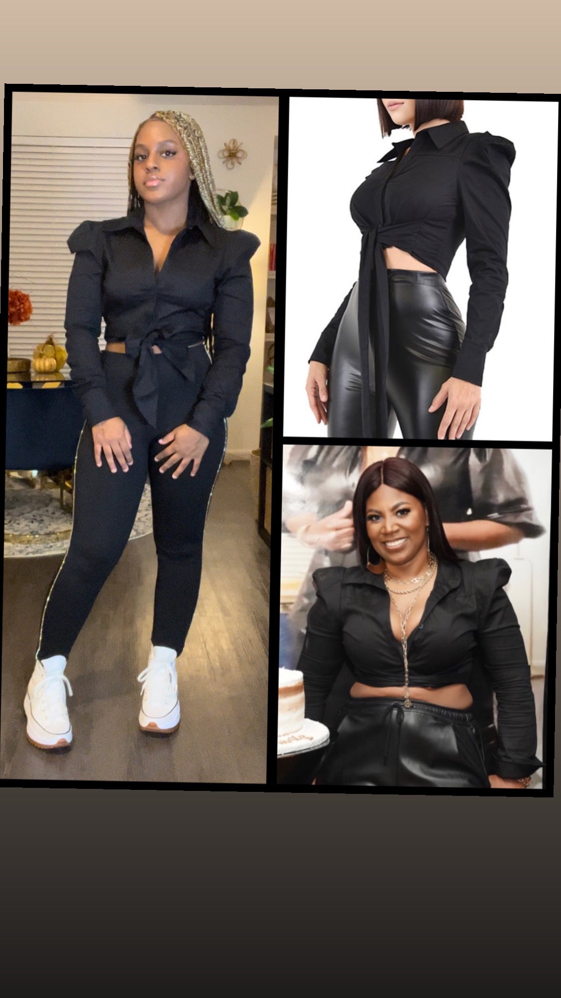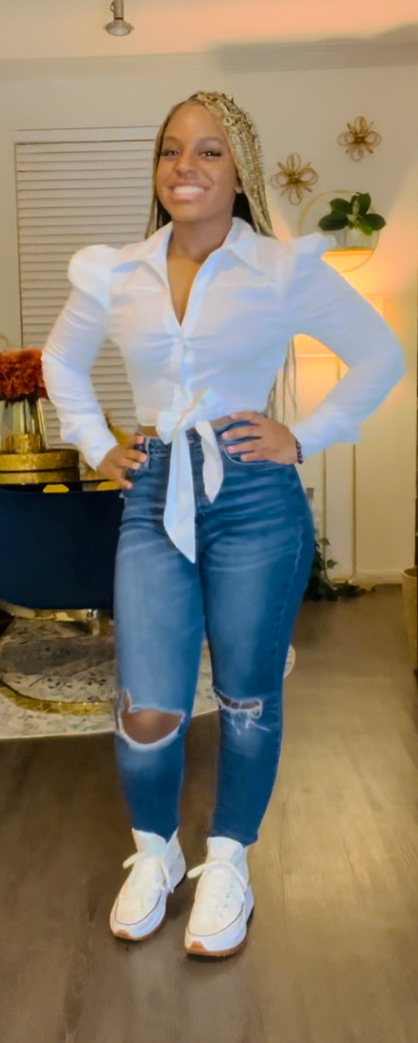 Long sleeve, puff shoulder, button down front, tie waist, cropped, stretch shirt. Lightweight material