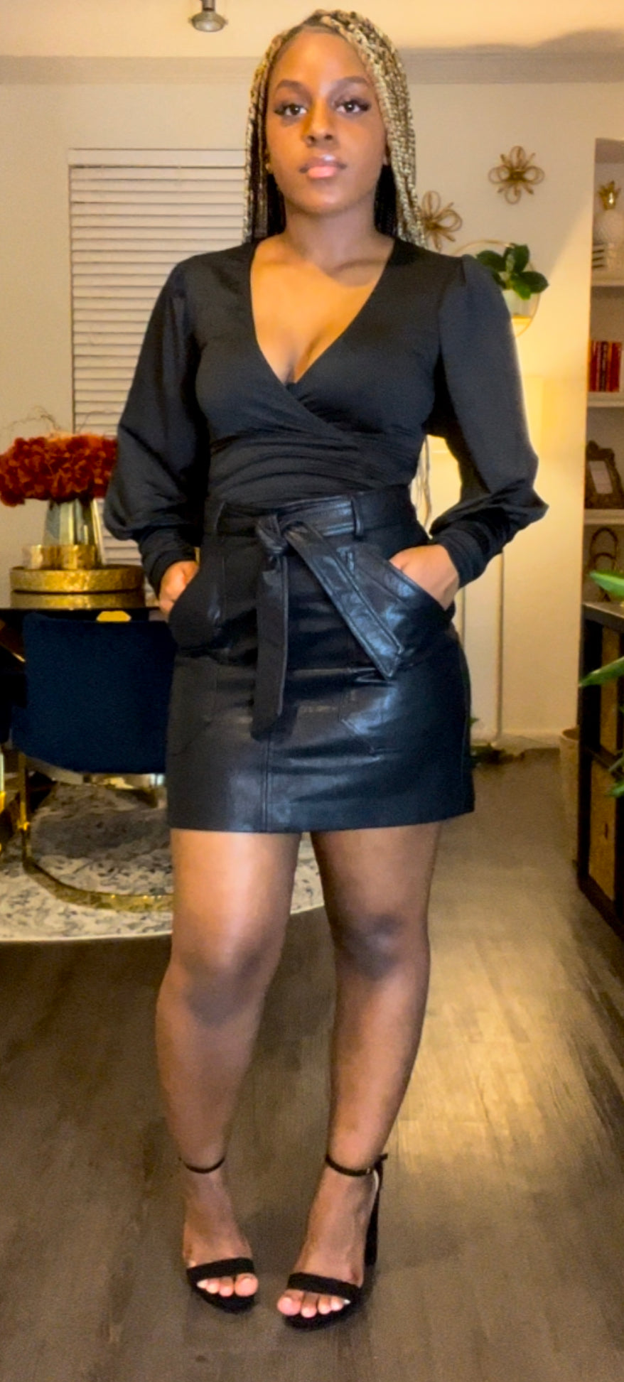 Black Faux Leather belted skirt w/pockets No stretch Junior size